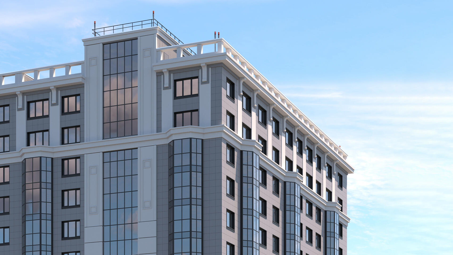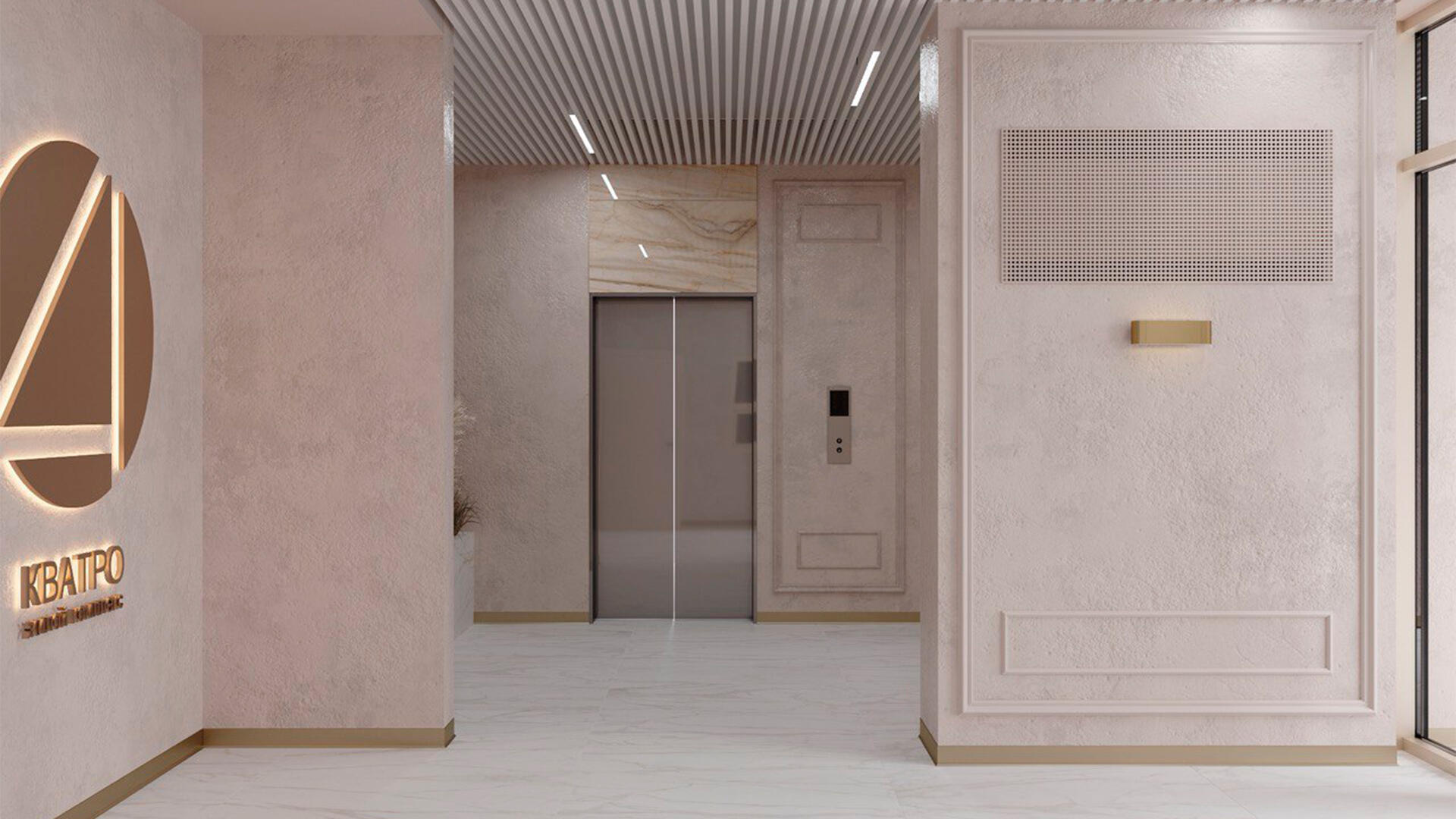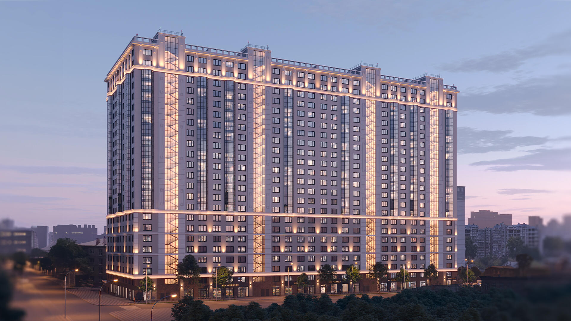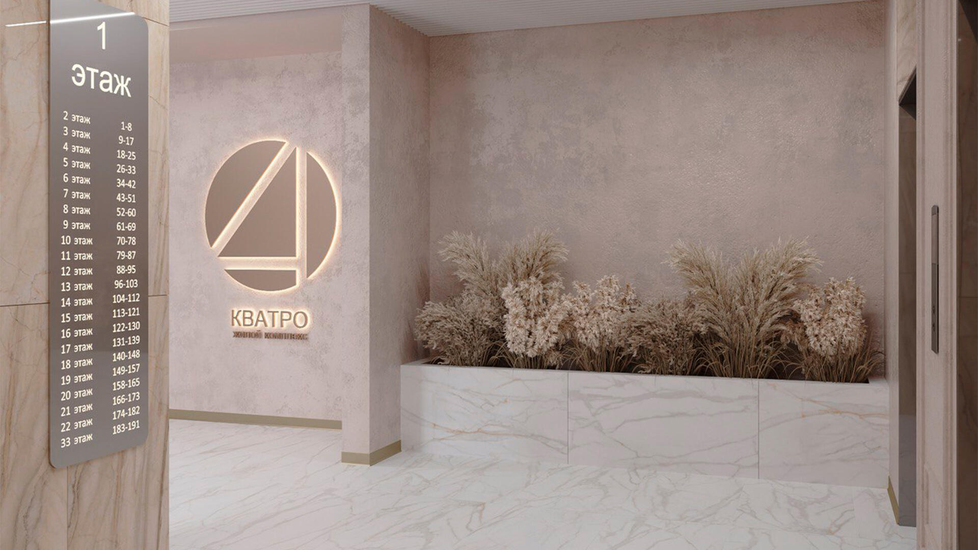 Фасад жилого комплекса «Кватро» вдохновлён направлением «сталинский ампир» с присущей ему монументальностью, классическими пропорциями и величественным декором. Точечная подсветка по периметру фасадной части ЖК текстурирует архитектурные особенности комплекса, акцентируя на них внимание.